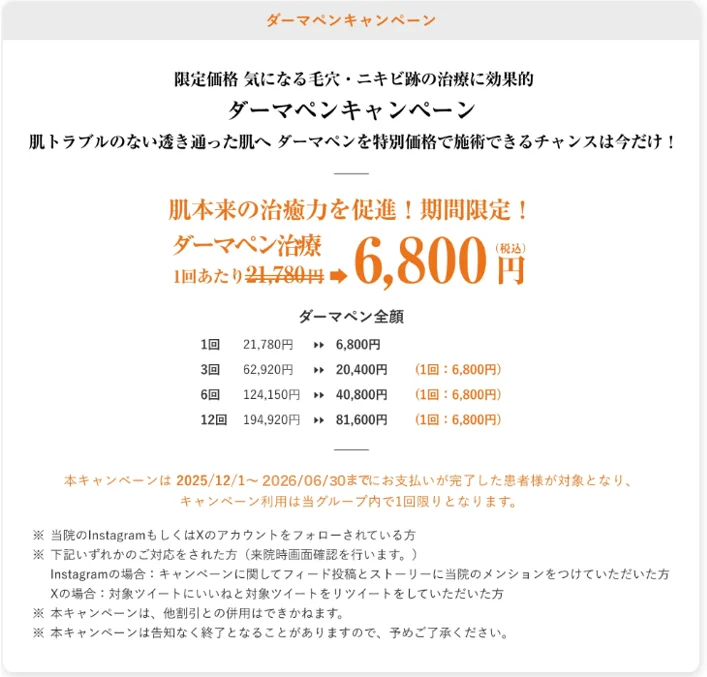 当院のダーマペンの料金は、施術部位や回数によって異なります。また、痛みや治療の雰囲気が気になるという方には、初回治療に限り通常価格より低価格にてお試しいただくことも可能となっております。